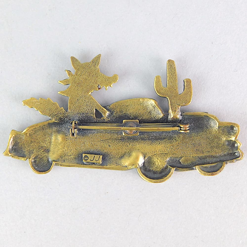 A bronzed metal finish brooch showing a coyote with bandana driving a cadillac through the desert. Signed JJ to the roll safety clasp.