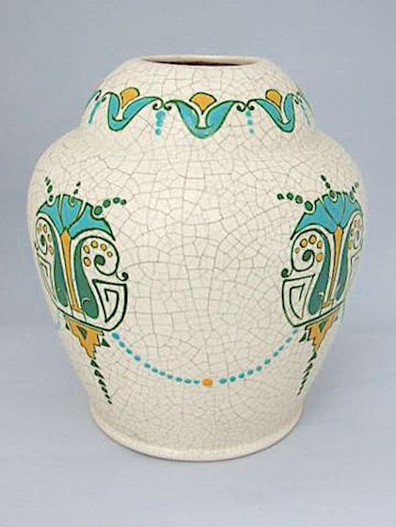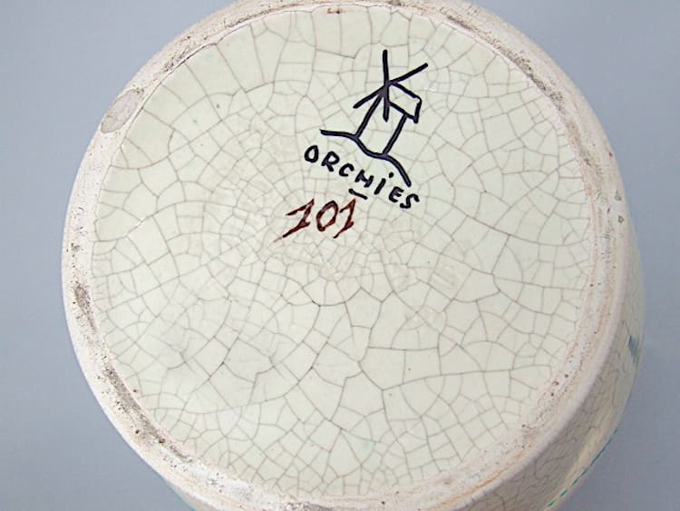 French ceramic crackle glaze vase, signed Orchies to the base and model number 101. With high enamel hand painted patterning in green, yellow and turquoise.