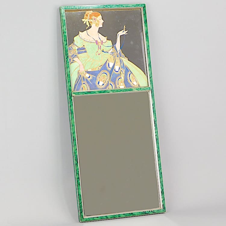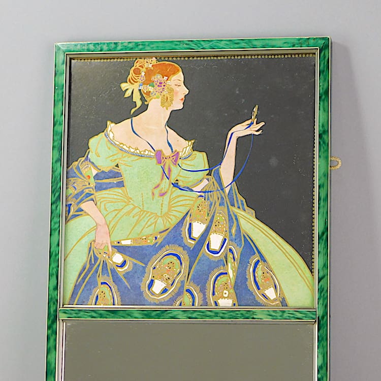 1920s Art Deco mirror by the Rowley Galleries. Vivien Mansell label to the back. Beautiful hand painted lady in a crinolyn dress.