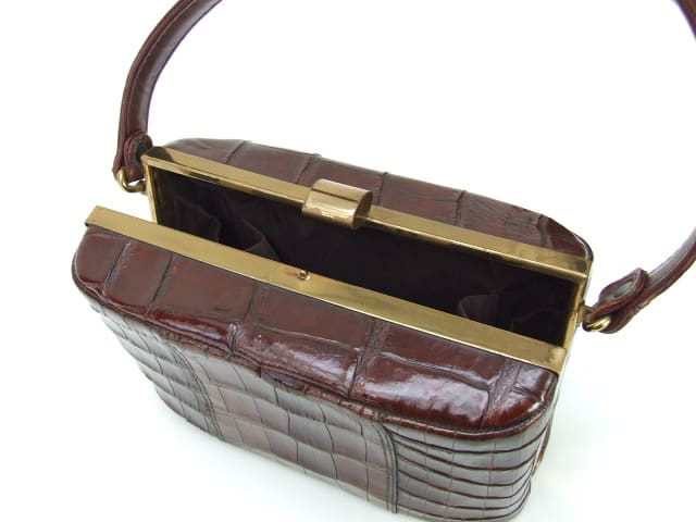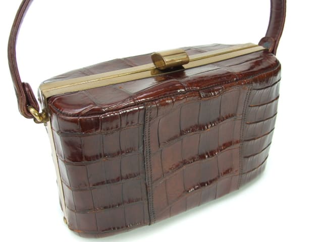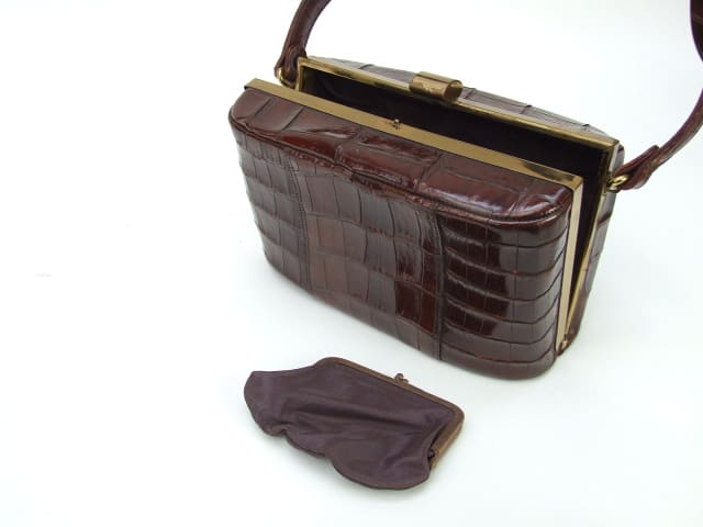 1940’s crocodile (possibly faux) box bag. Inside is lined in silky brown material with three inside pockets and an original matching purse. No makers mark but possibly American.