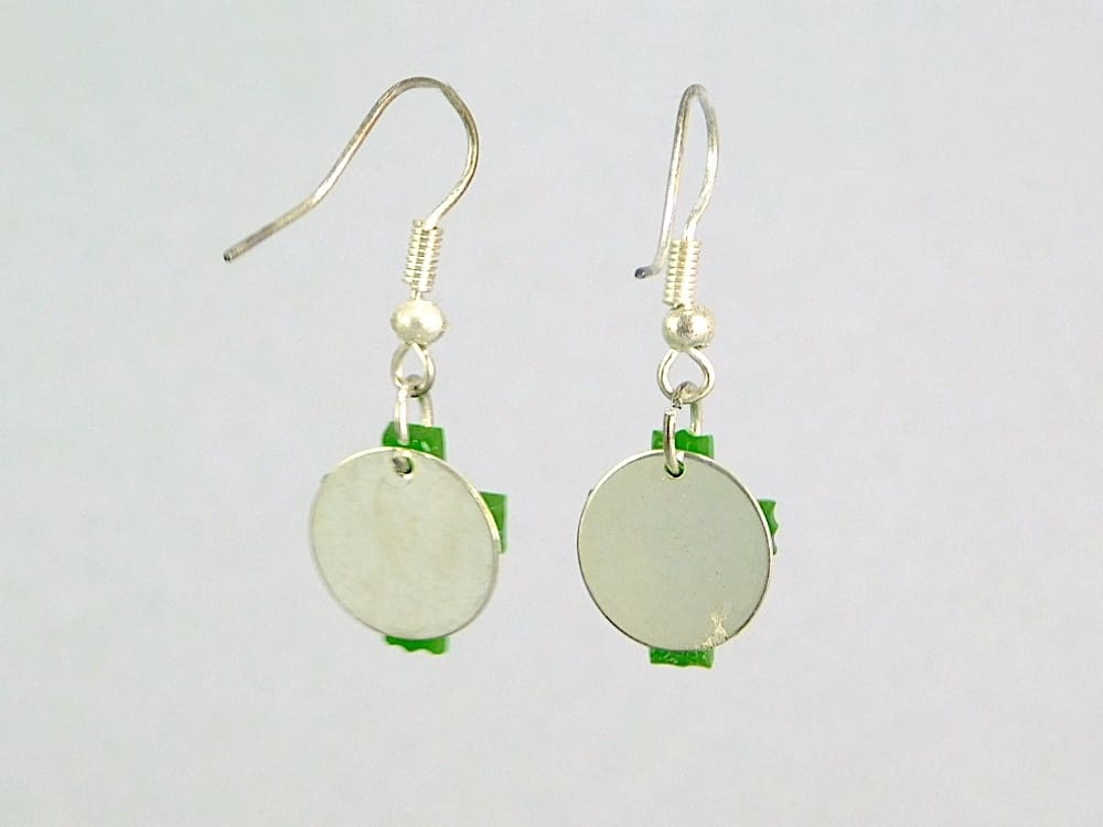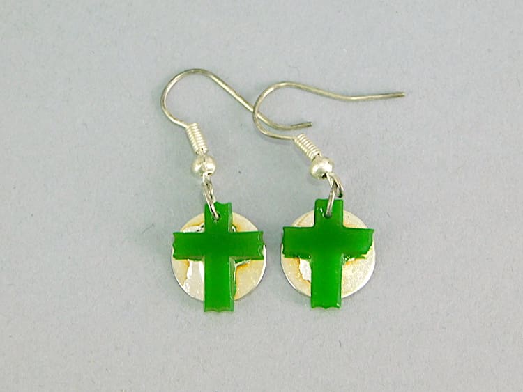 Green galalith crosses mounted on circular chrome backs. Made by Jacob Bengel for pierced ears.