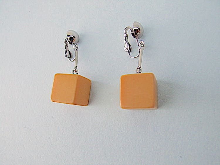 Modernist mustard galalith Cube earrings, made by Jakob Bengel in the early 1930’s. Fitted with clip on fittings.