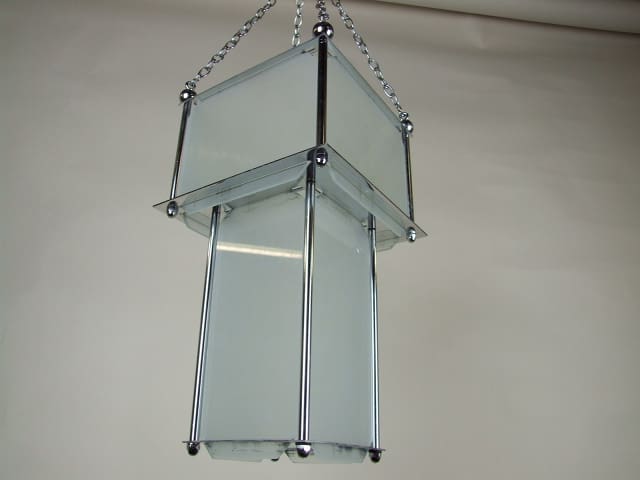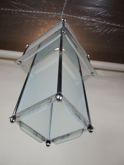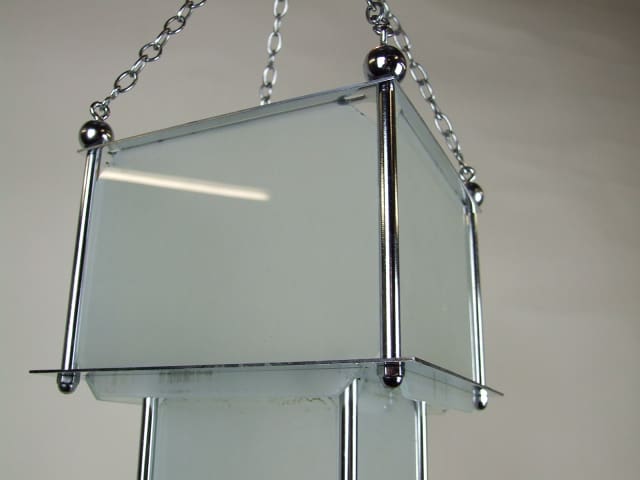 A chrome and frosted glass lantern type ceiling light with chrome ball feature and frame. No electrical fitments present as this light hangs from, and is lit by your existing pendant.