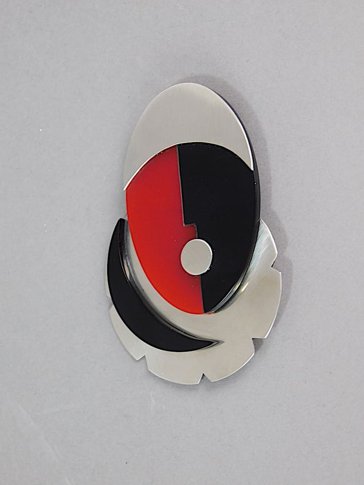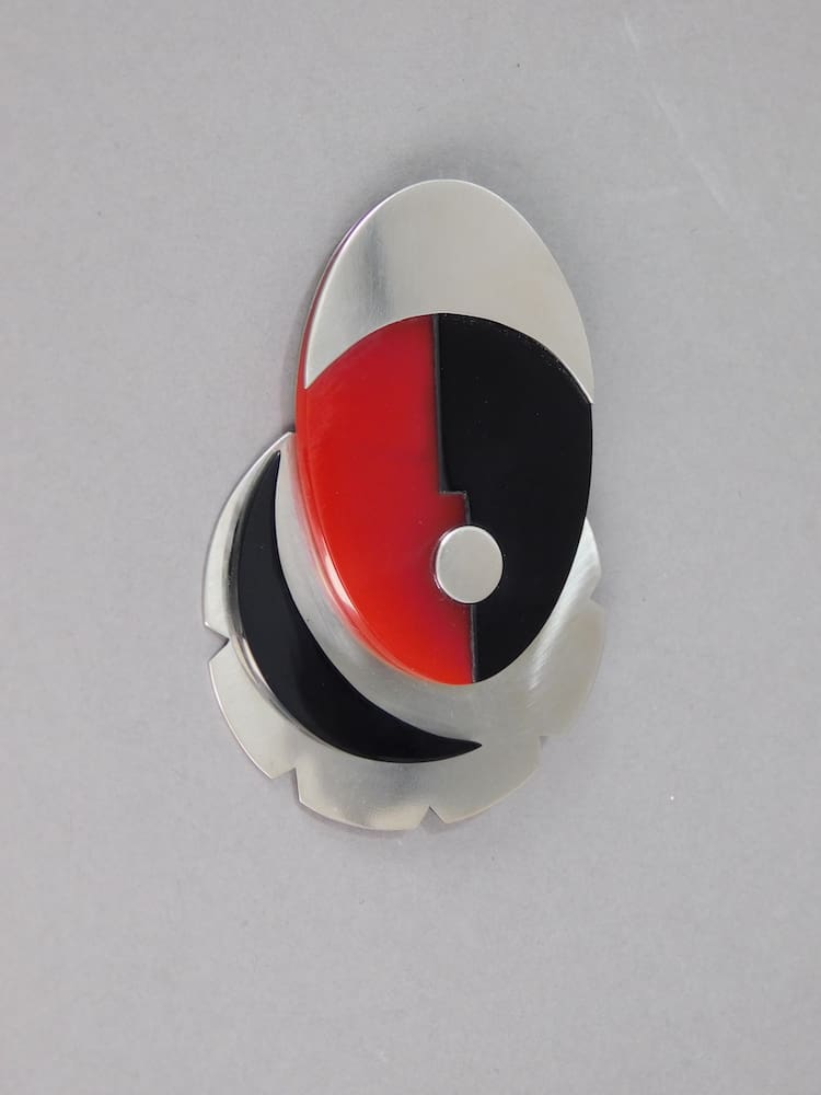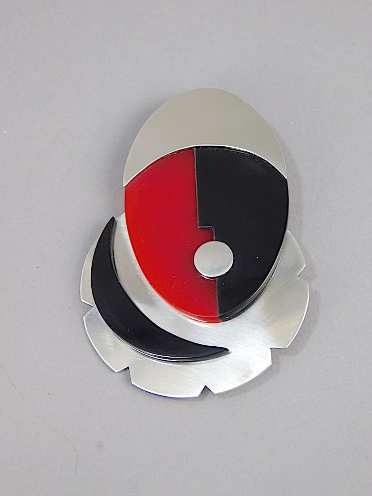 Large French art deco modernist stylised phenolic and chromed metal Pierrot head brooch. Very cubist in design and fitted with a roll safety clasp.
