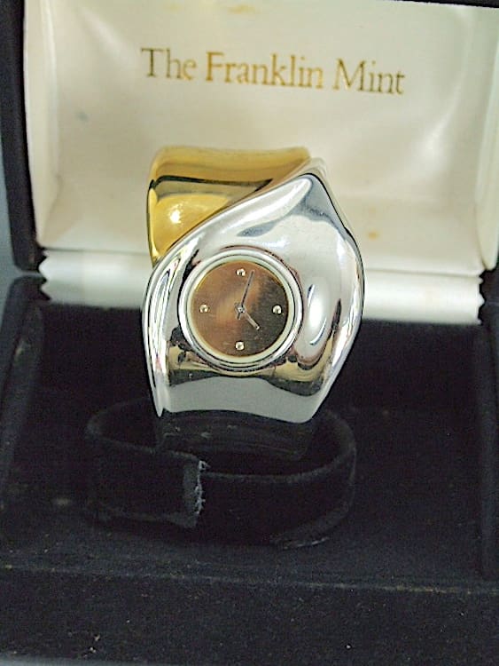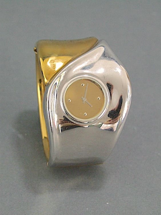 Unusual silver and gold plated cuff watch bangle, was designed in the 1980s by Americas foremost jewellery designer – Alfred Durante in a very deco design.