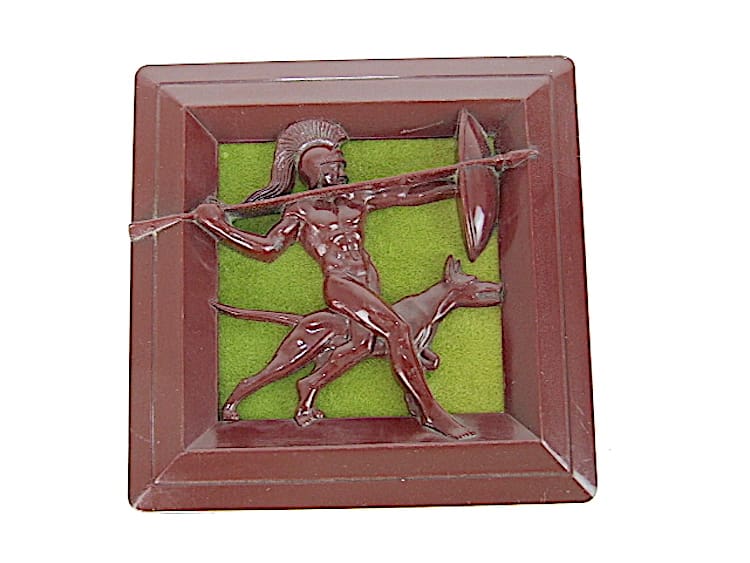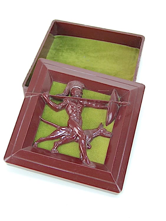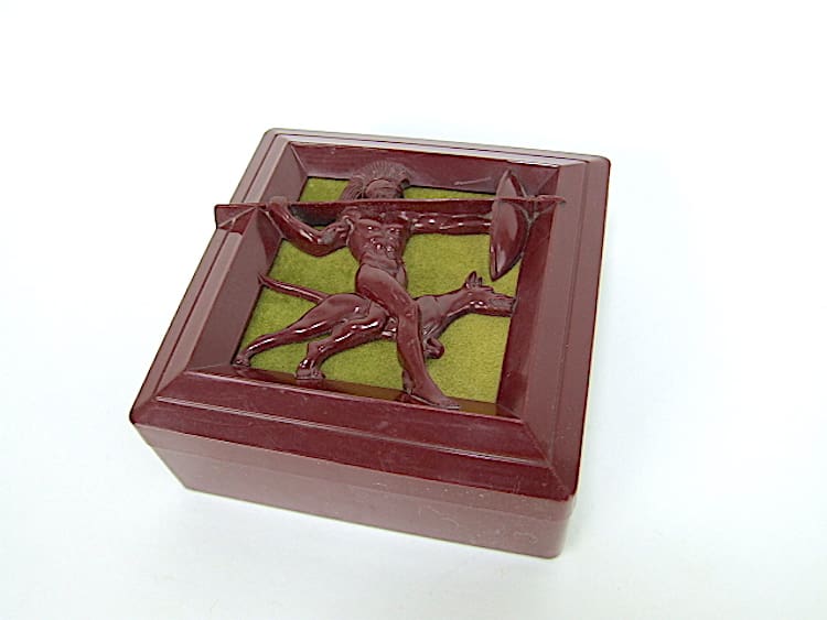 American phenolic box signed Hickok inside. To the lid is a male warrior and dog. I am presuming it is a jewellery box.