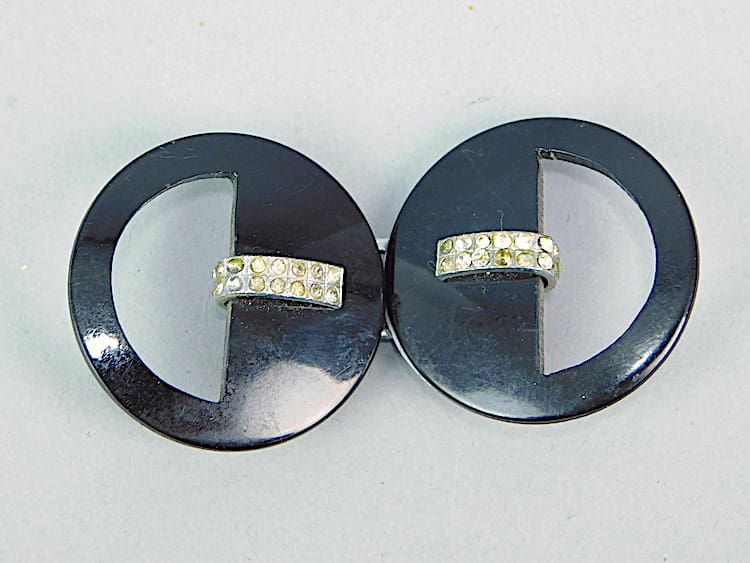 Black celluloid and diamonte circles belt buckle. Marked Czech to the clasp.