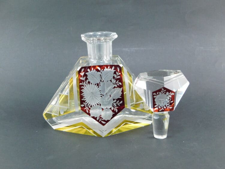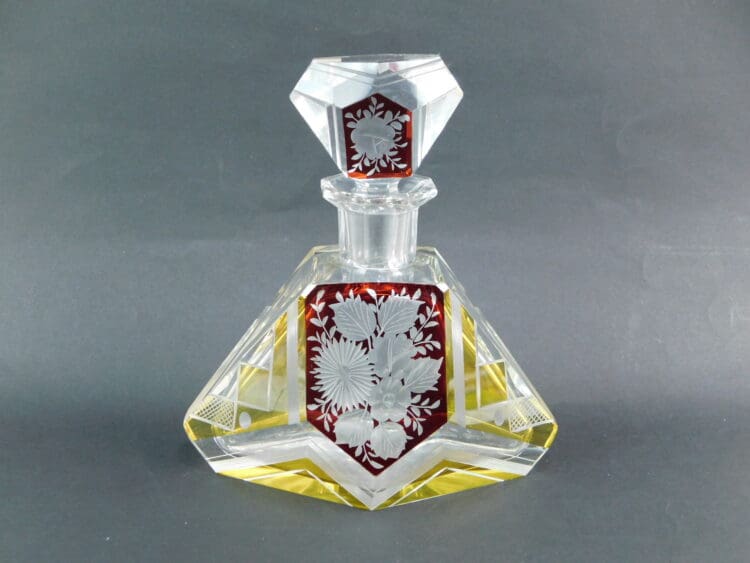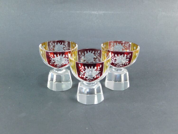 Another lovely piece of Czech leaded and cut glassware. Decanter and alas only 3 glasses. With red enamelled and etched flower detailing, and also gold geometric panels.