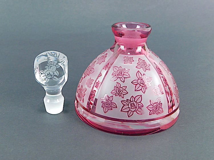 Pink vintage frosted glass and etched floral motif scent bottle.