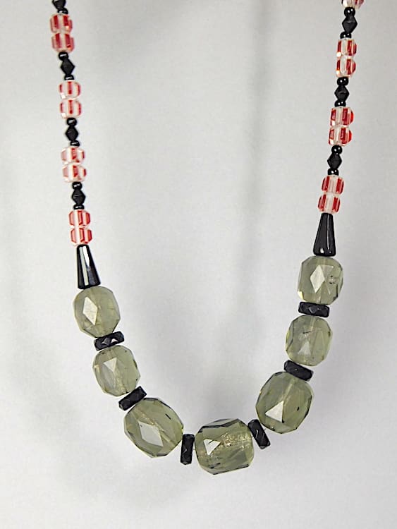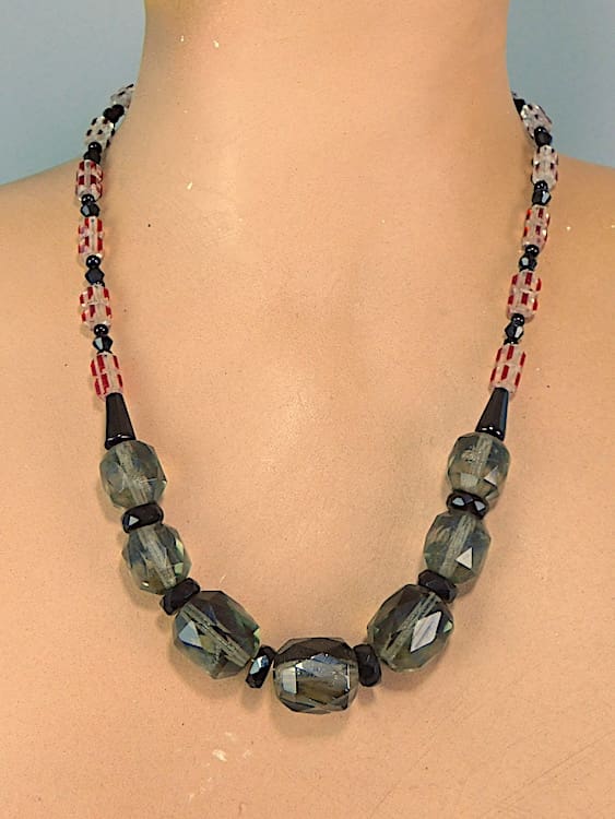 Chunky 1920’s Czech faceted glass necklace with smokey grey, black and red beads. Fitted with a screw clasp.