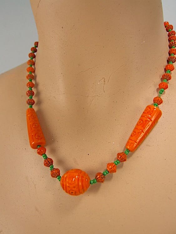 Orange and green Czechoslovakian glass Egyptian themed necklace.