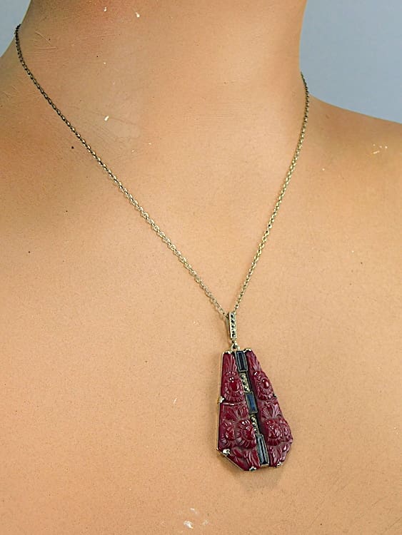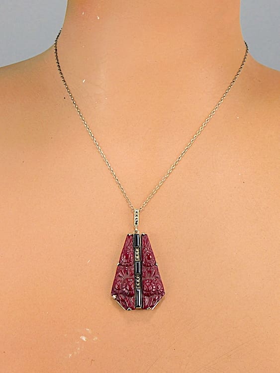 1920’s dark red glass pendant with stylised floral patterning molded in the glass and central rhinestones.
