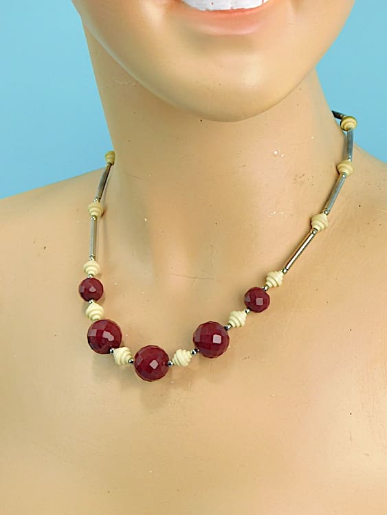 1930’s Czech burgundy and cream celluloid necklace, with faceted beads. Recently restrung.