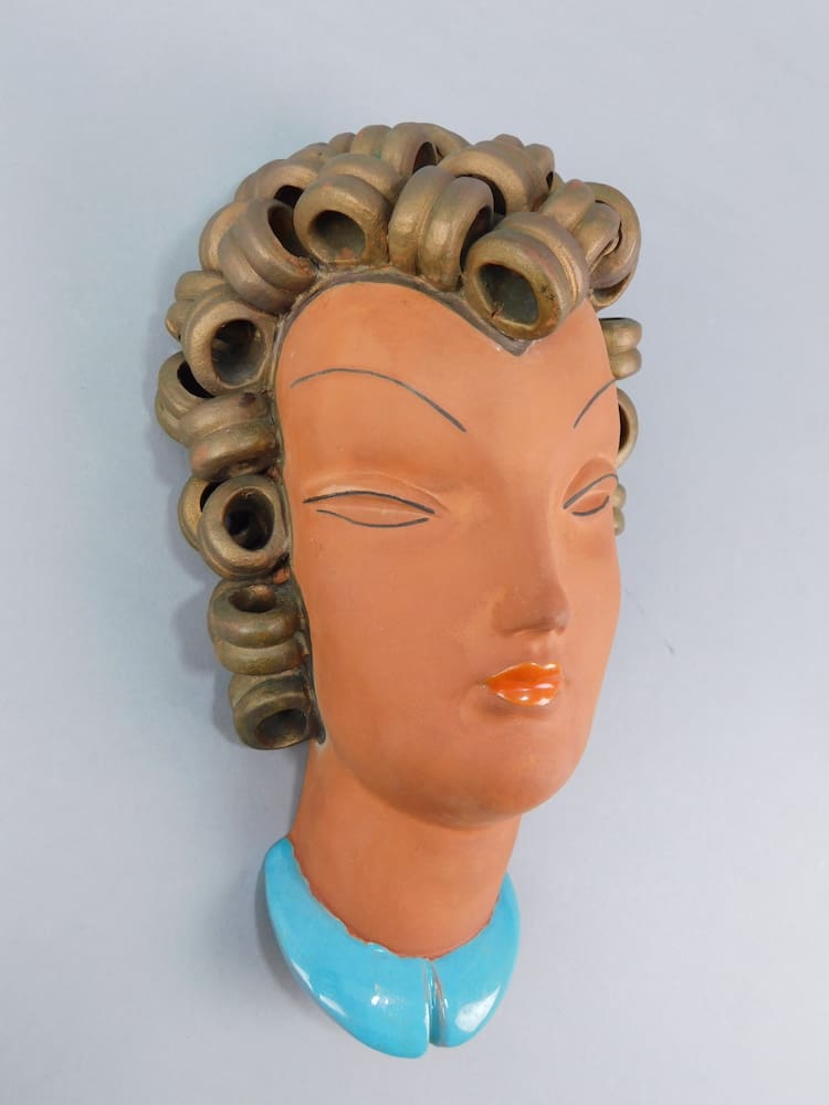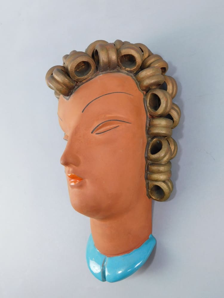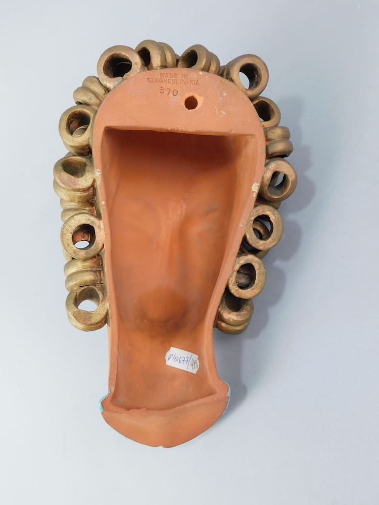 A lovely 1930s terracotta mask, maker unknown but marked Made in Czechoslovakia and numbered 370. She has a matt skin tone and glazed collar and lips and with curled hair.