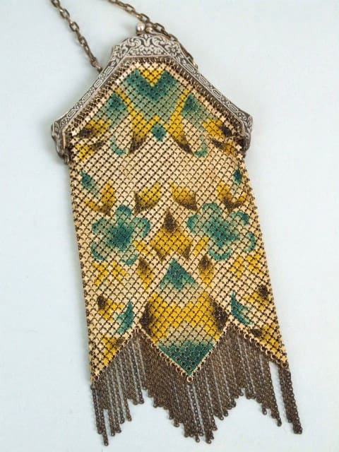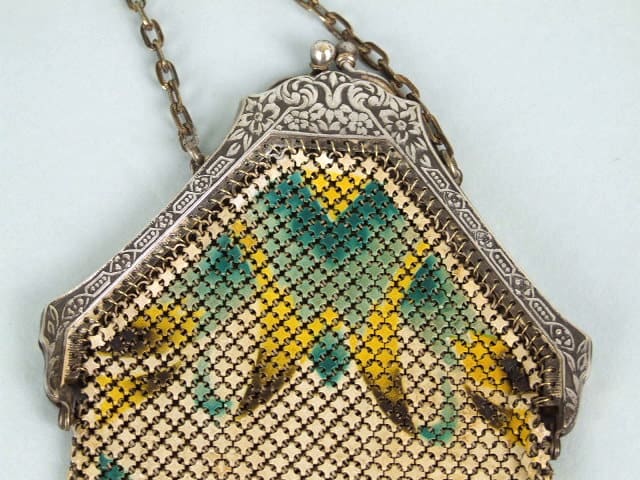 Art Deco metal mesh dance hand bag with ornate top frame, made in the 1920’s. Signed inside Mandalin and Co.