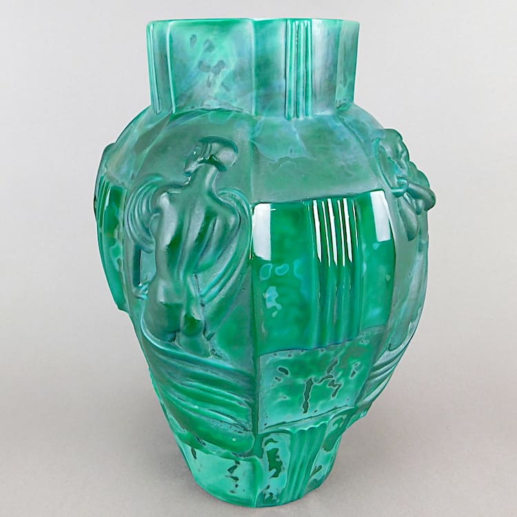 Malacite glass vase decorated with 4 different lady designs around the outside, model number 25531.