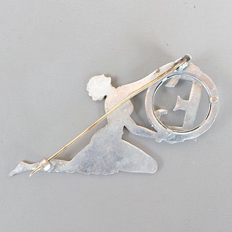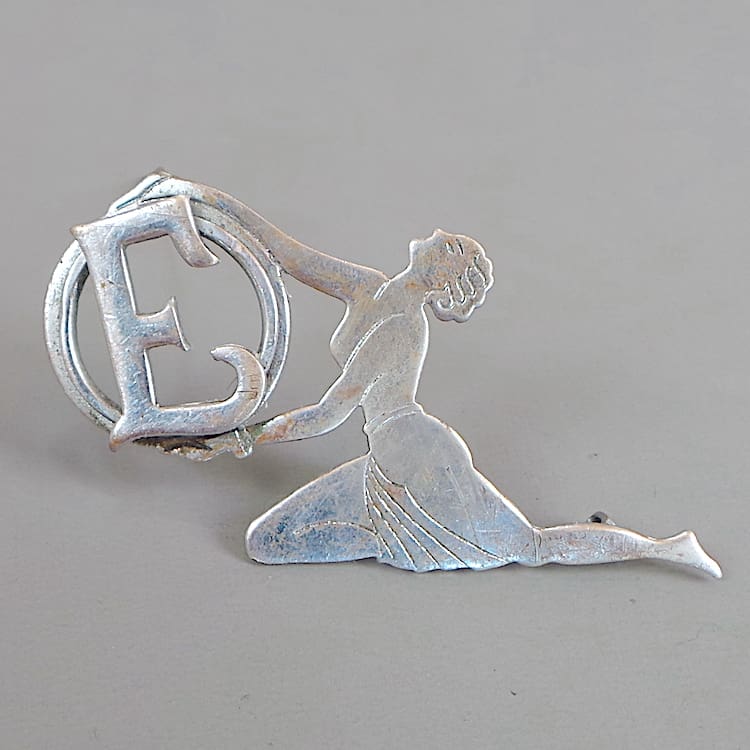Chromed metal dancer brooch holding the initial letter E.