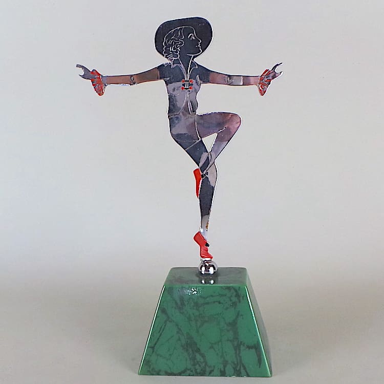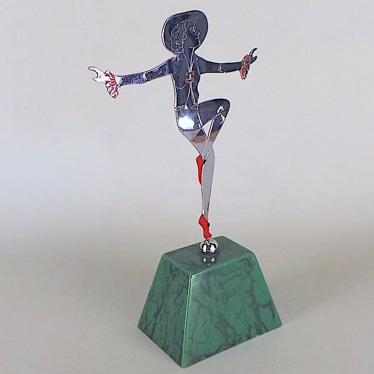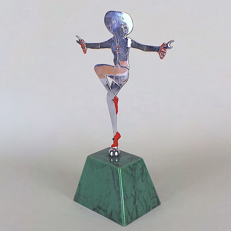 2D chromed metal dancer in a shorts costume with red and black enamel painted detailing.
