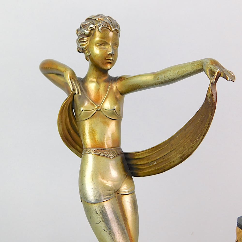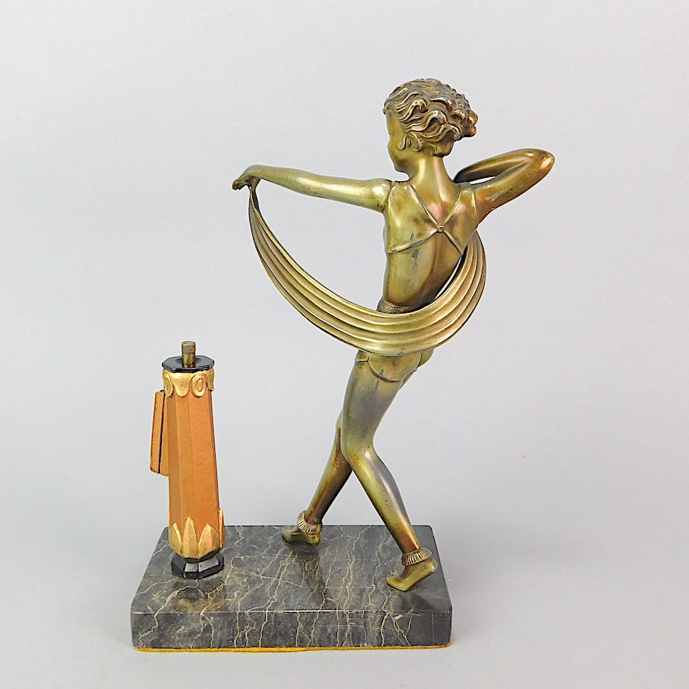 Austrian spelter unsigned Lorenzl scarf dancer striker (cigarette lighter). Mounted on a blackened white striated marble base.