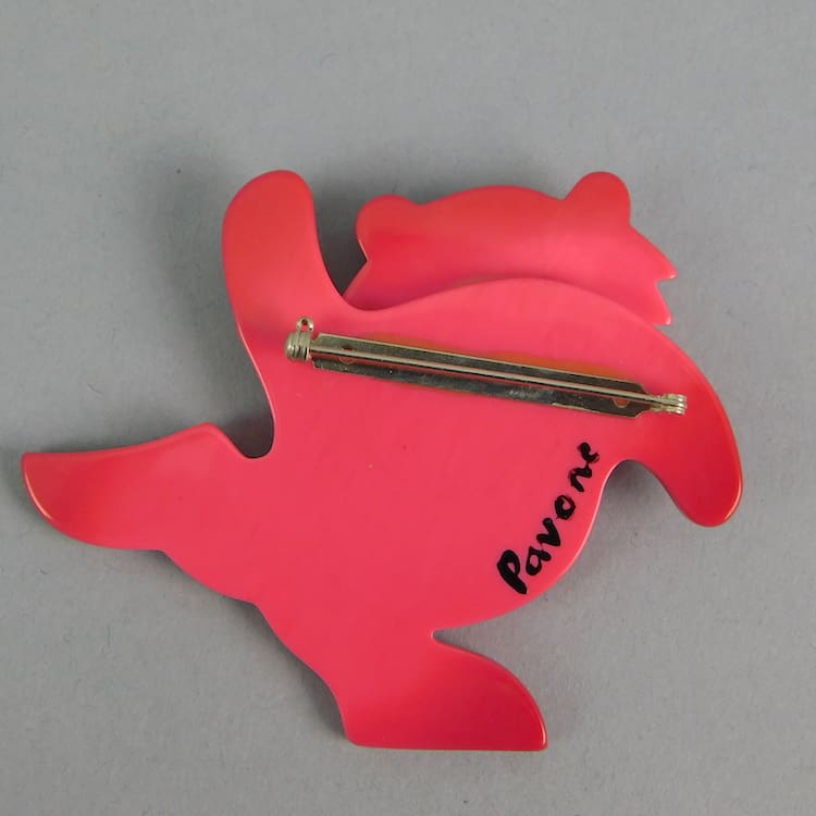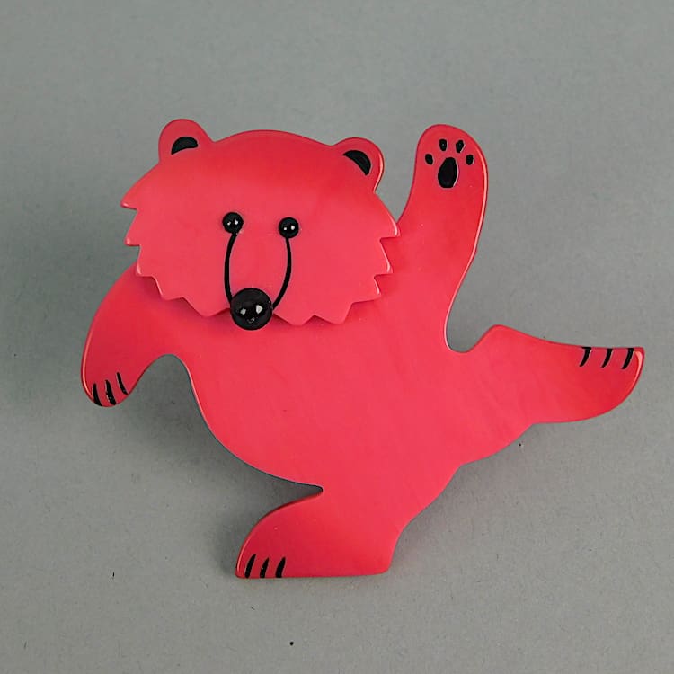 Cute carved orange galalith, hand painted dancing bear brooch. Fitted with a roll safety clasp and signed by Pavone to the back. As new condition. 3.25 inches (8cm) wide, 2.75 inches (7cm) high.
