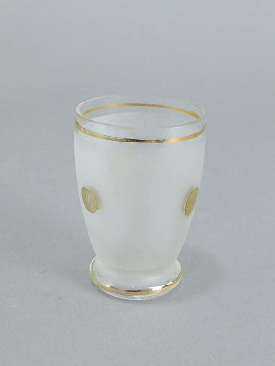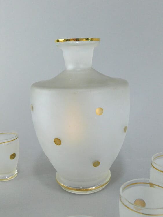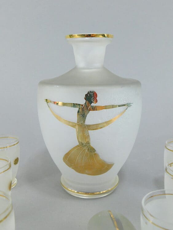 English Art Deco decanter set with a silver dancing nude on the decanter bottle. There are 6 small glasses.