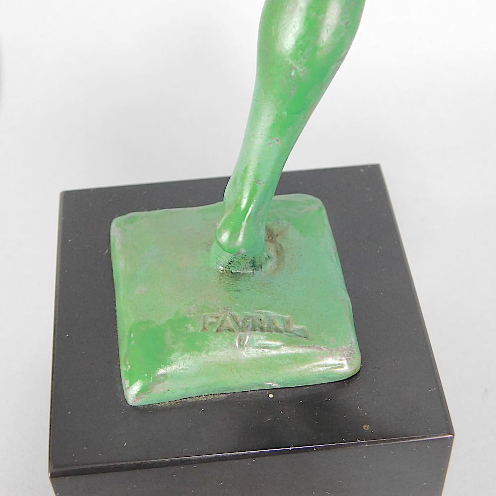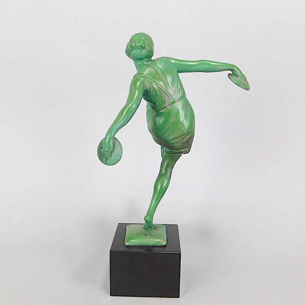 This is the smaller version of this statue, produced by the Le Verrier foundry, model number 954 in the late 1920’s – early 1930’s. Her original title is Danseuse Aux Cymbales. She was designed by Pierre le Faguays using his pseudonym – Fayral, is is signed Fayral to the base. She is mounted on a black marble cube base.