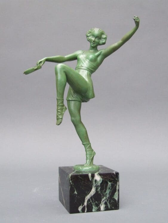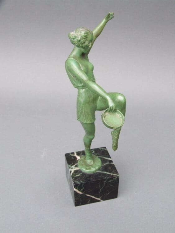 A French art deco statue by Pierre Le Faguays (signed Fayral – his pseudonym). She is a cymbal dancer in Grecian dress produced by the Le Verrier foundry in the early 1930’s. Mounted on a verdigris baseĀ and signed Fayral to the metal base socle.