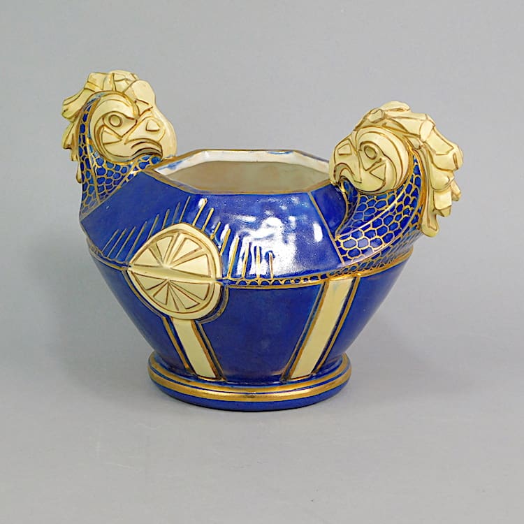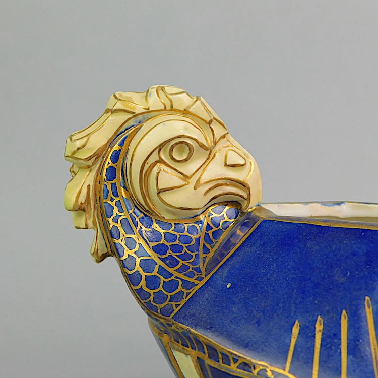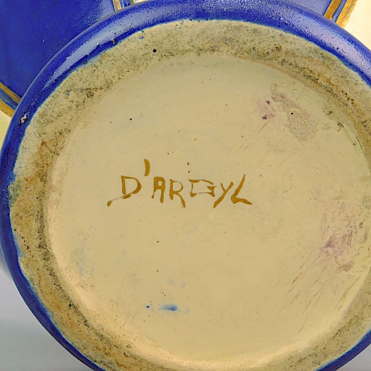 French faience (earthenware) vase with beautiful hand painted enamelling in navy, cream and gold. There is an eagles head to either side and it is signed by the artist – D’argyl.