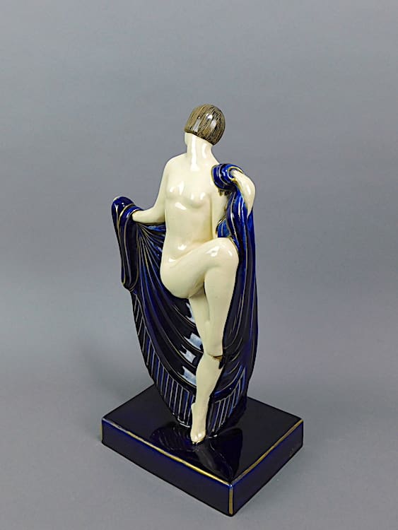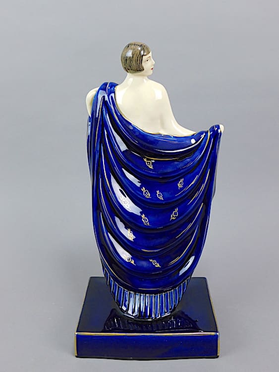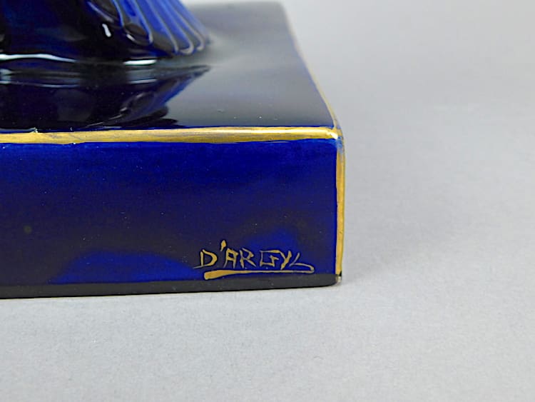 French ceramic female dancer, glazed in vivid royal blue with gilt patterning. Signed D’Argyl to the side of the base.