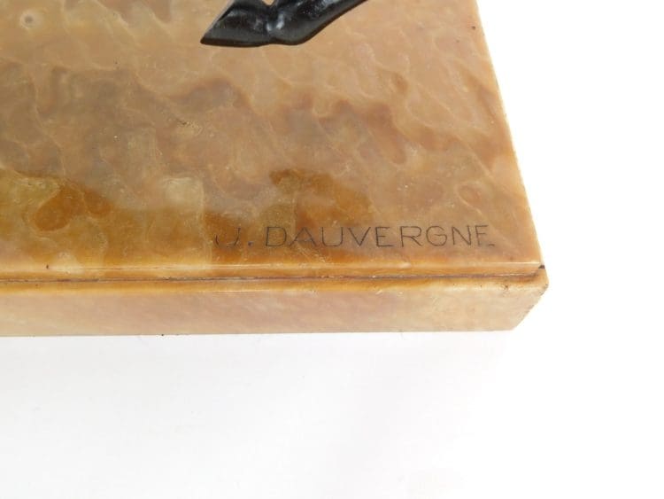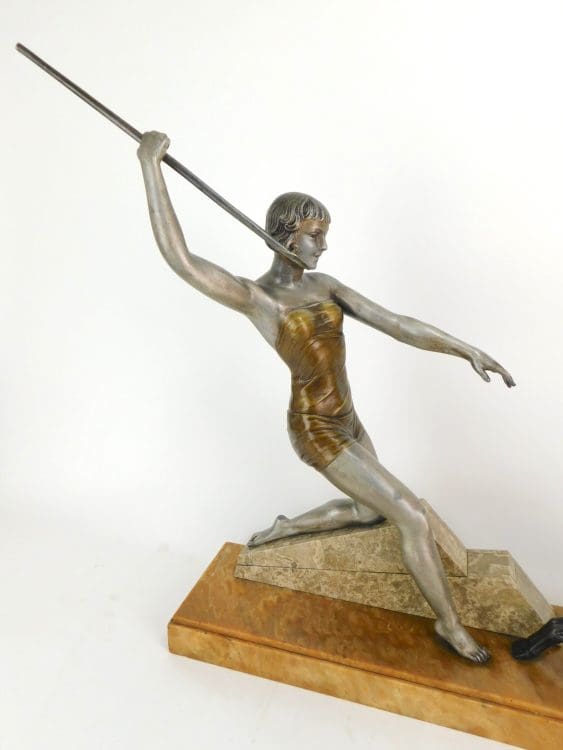 A silvered patina spelter woman with spear and with bronzed robe detail.