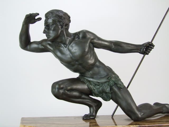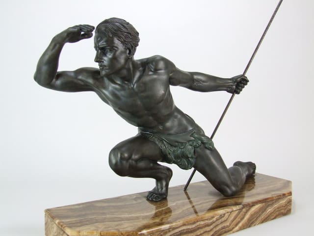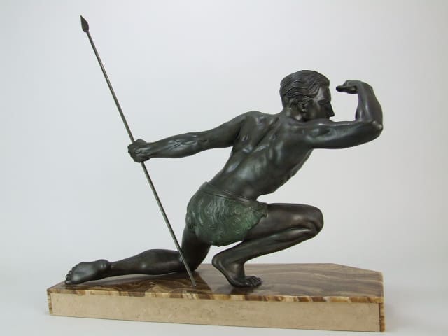 French bronze patinated spelter male in green loin cloth, an art deco statue by Joe (Jean) de Roncourt and signed to the brown onyx base.