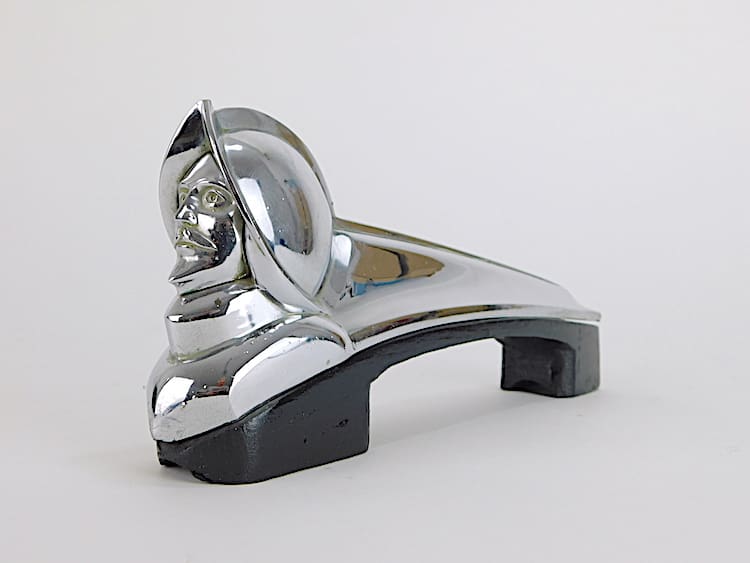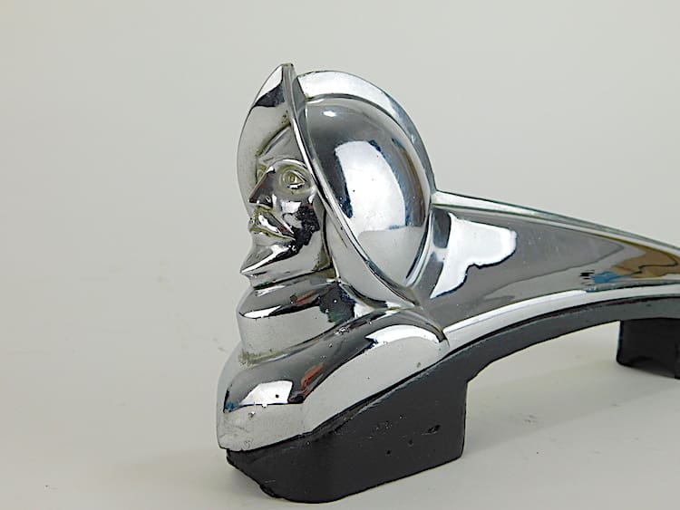 I believe this Spanish conquistador Hernando De Soto car mascot (hood ornament) was made in the late 1930s/early 1940s. De Soto was part of the USA Chrysler motor works. This mascot was their logo. Mounted on a scratch built wooden base.
