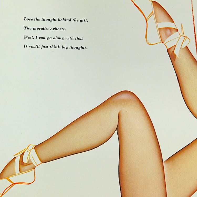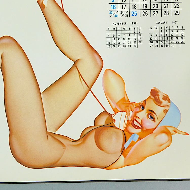 George Petty calendar girls page. Ideal for framing as a group as I have many Petty. Varga and other artists calendar girl pages. This one dates to 1956 and is December.
