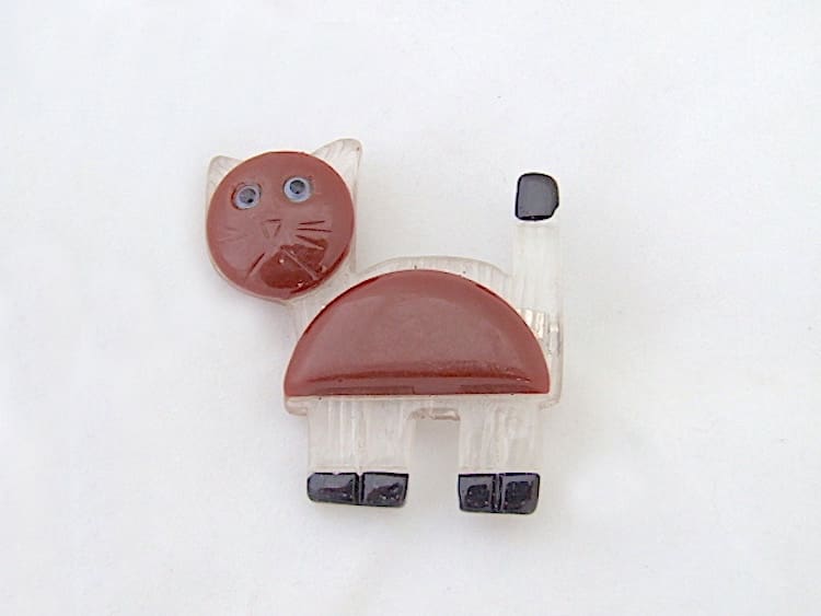 Brown plastic cat brooch, fitted with a roll safety clasp.