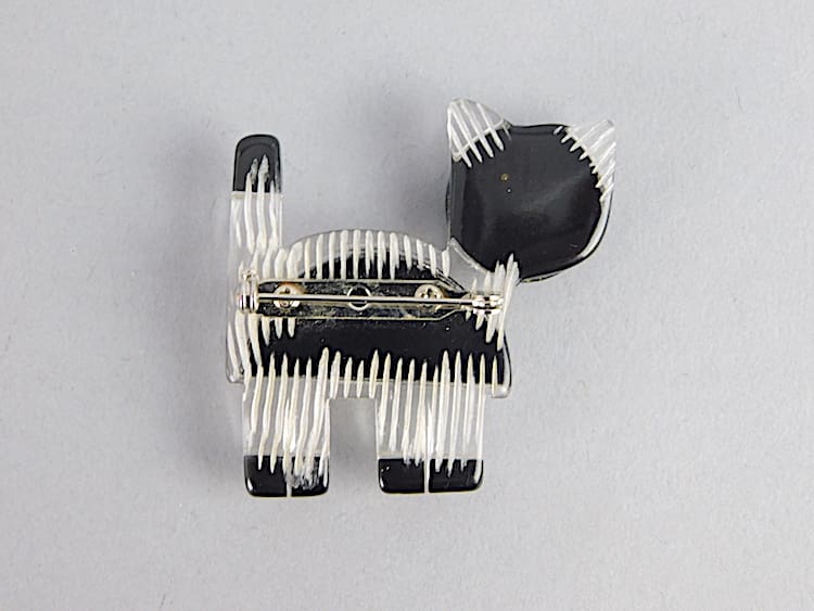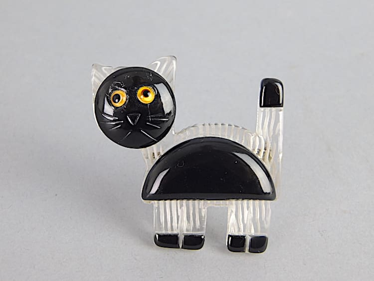 Black plastic cat brooch, fitted with a roll safety clasp.
