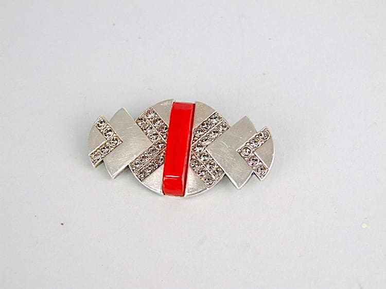 French silvered metal fans brooch with red phenolic central panel and diamonte detailing. Marked Depose to the back and marked with a makers stamp which is unreadable. It is fitted with a roll safety clasp.