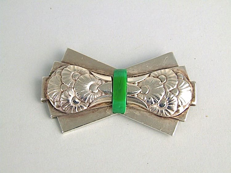 Large heavy silvered metal stylised floral brooch with green phenolic central stone. It is fitted with a roll safety clasp.