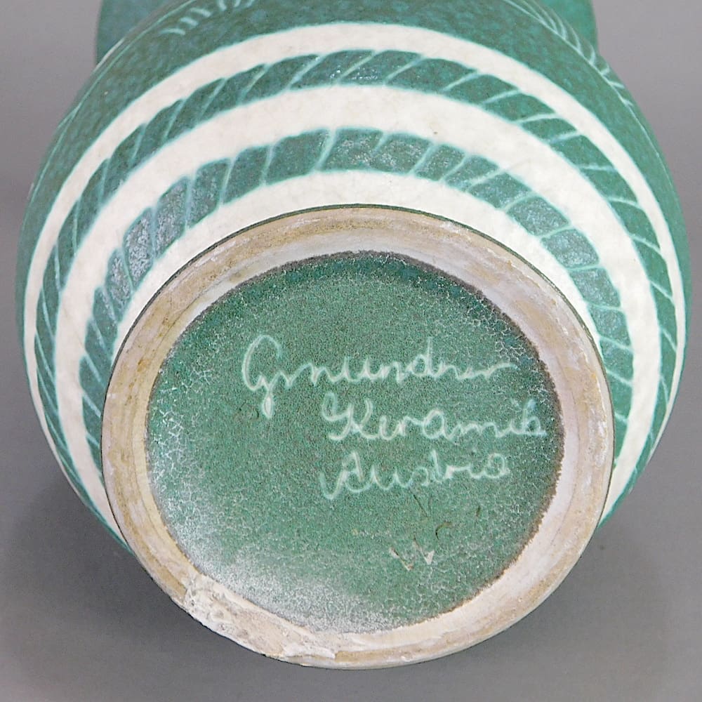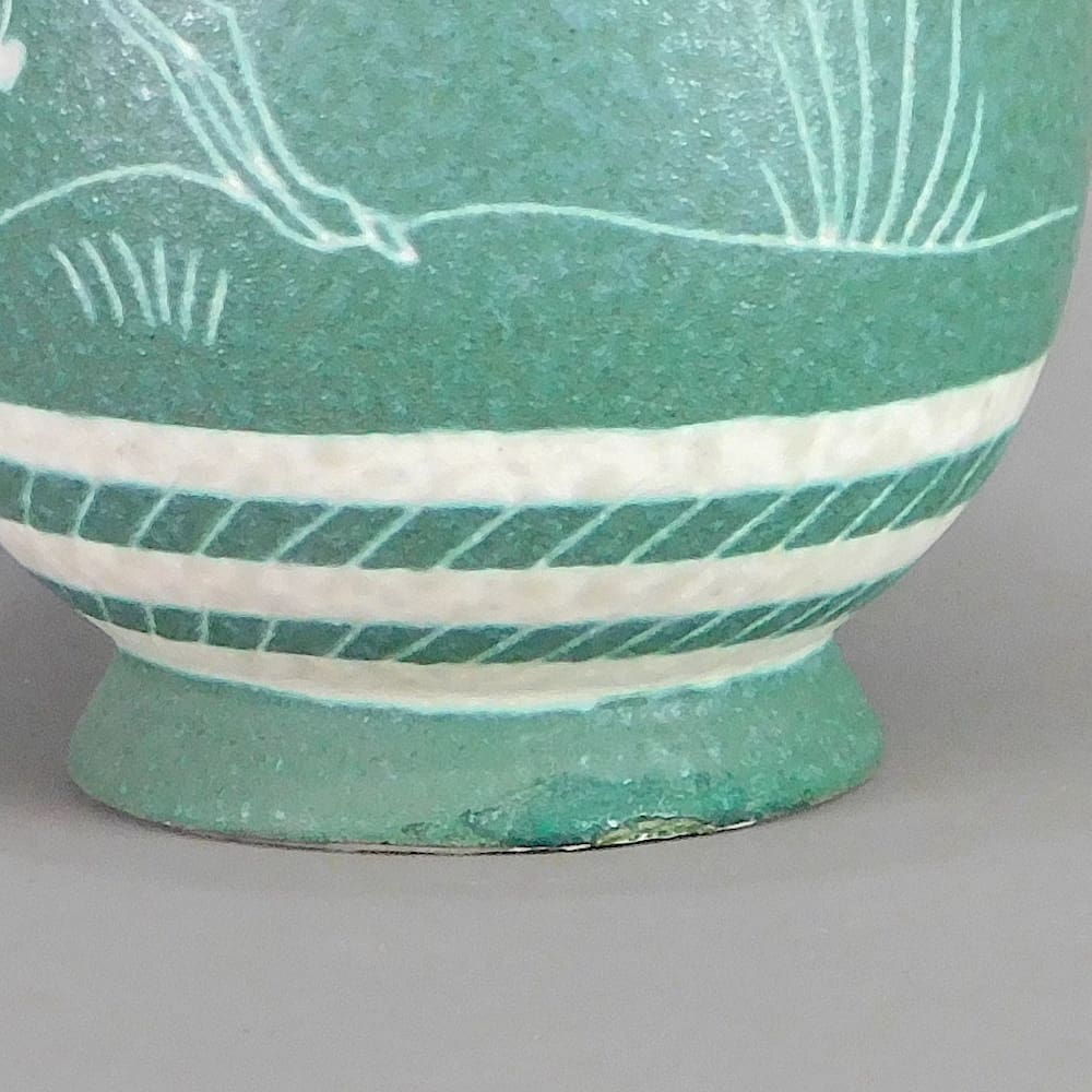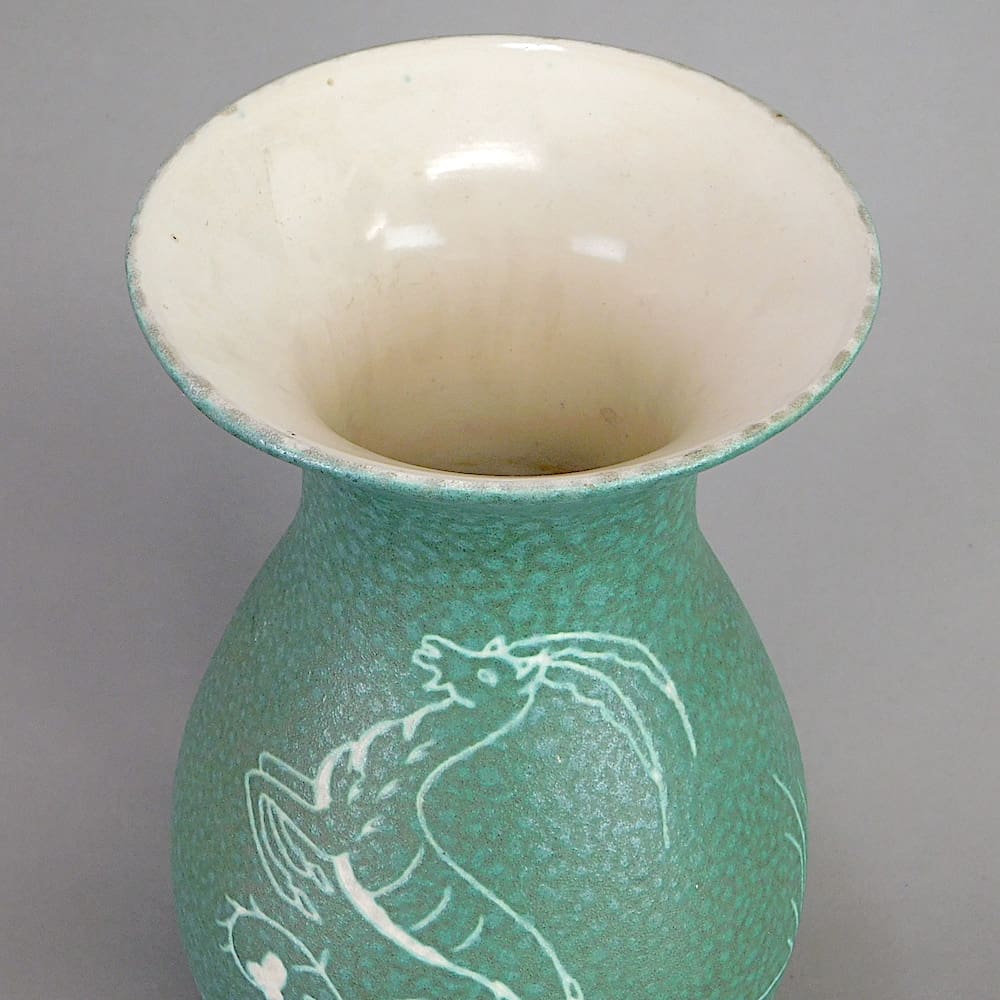 Sponged ceramic art deco vase depicting a leaping deer and foliage, repeated on both sides.