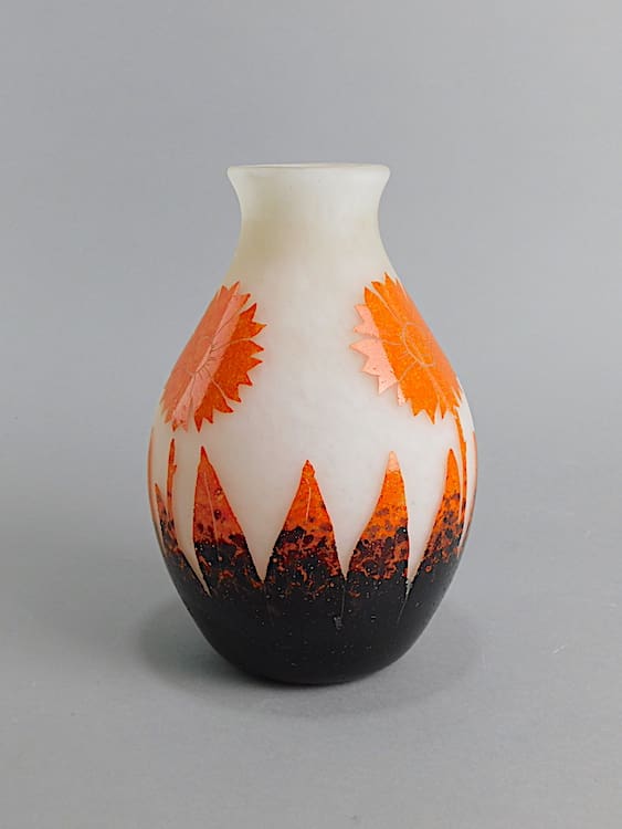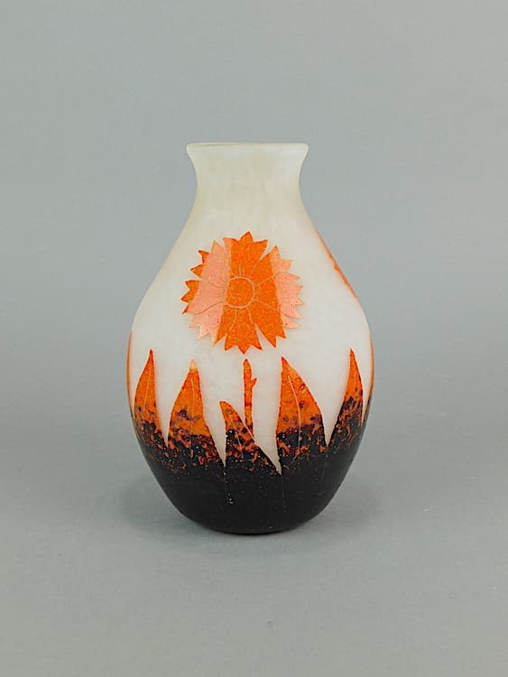 French art deco sunflower glass vase – a signed piece by Degue. Signed to the brown glaze.