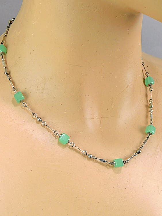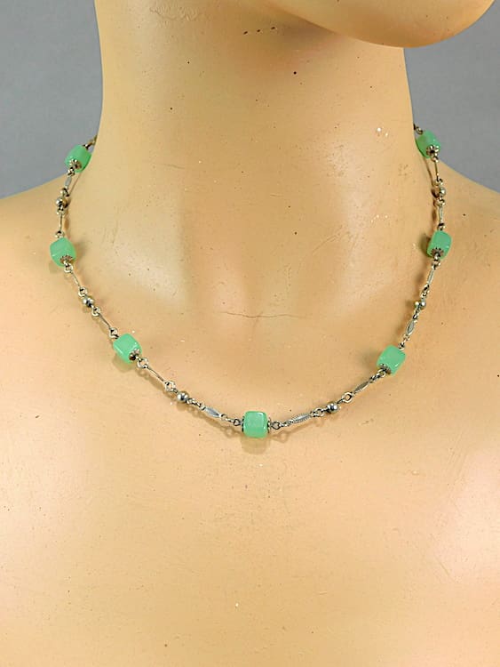 Intricate chrome chain with green glass cubes.
