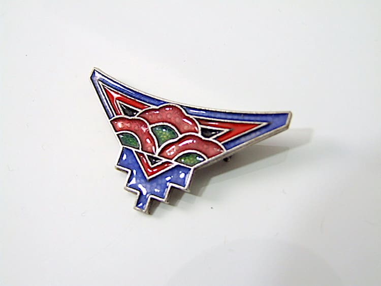 French enamel art deco brooch with stylised floral patterning. It is fitted with a roll safety clasp.