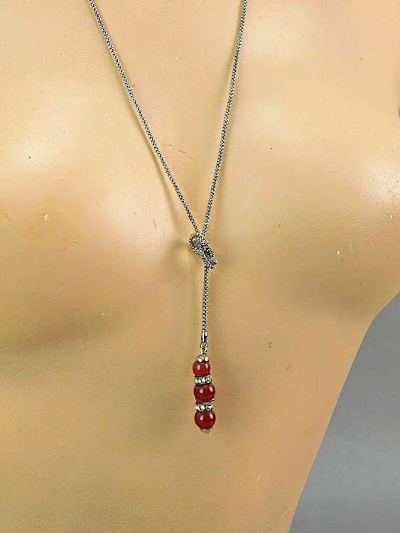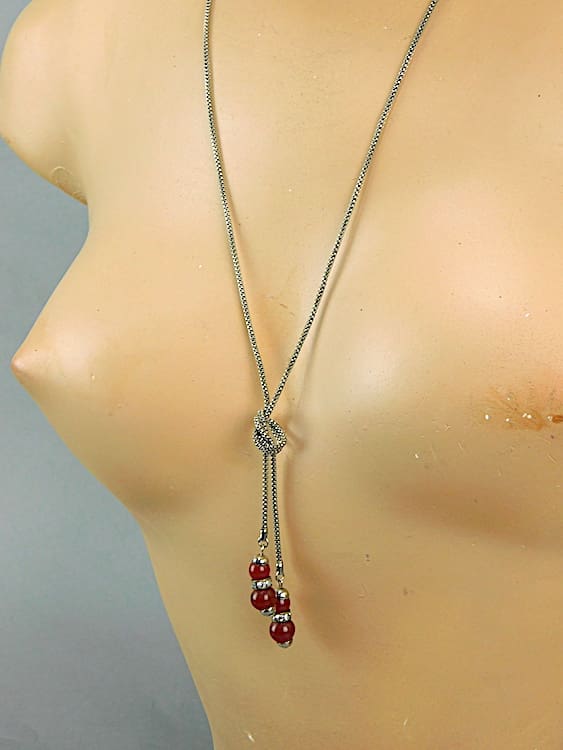 Thin snake chain ties in a knot, end tassels are amber glass balls with diamontes. Made in the early 1930’s by Bengel.