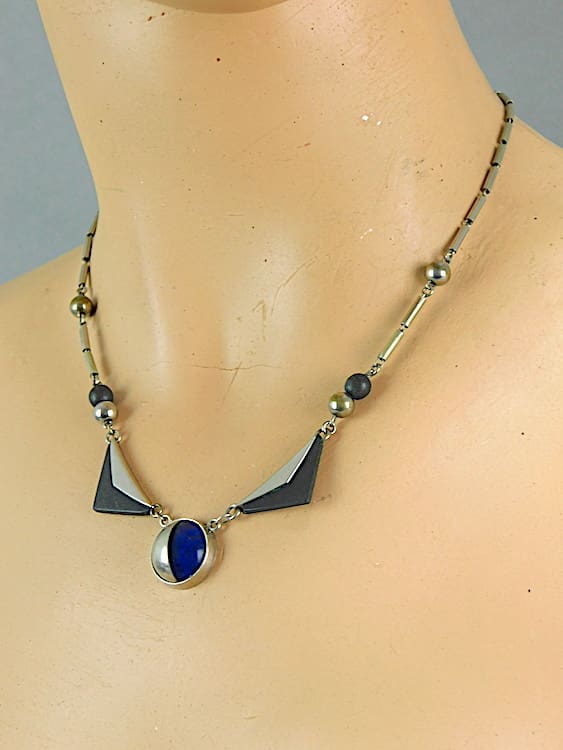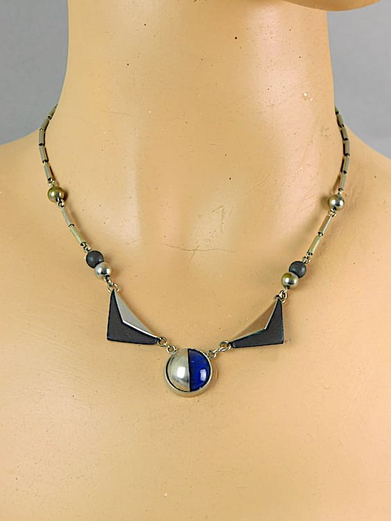 Blue and black and chrome art deco necklace. Made by Jakob Bengel in the early 1930s.