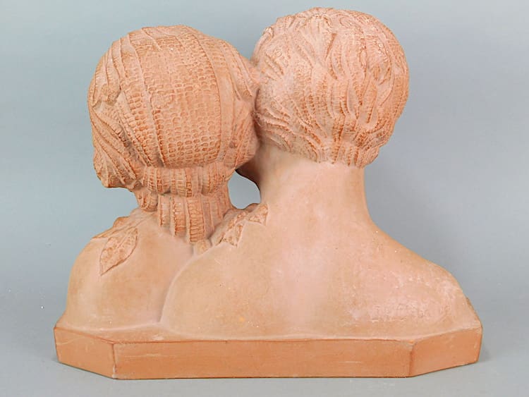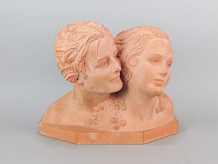 French Art Deco terracotta figure – a signed piece by Demetre Chiparus. Signed to the base. A man and woman (the woman is modelled as Lullier – Chiparus’ wife) with cherry and leaves detail.