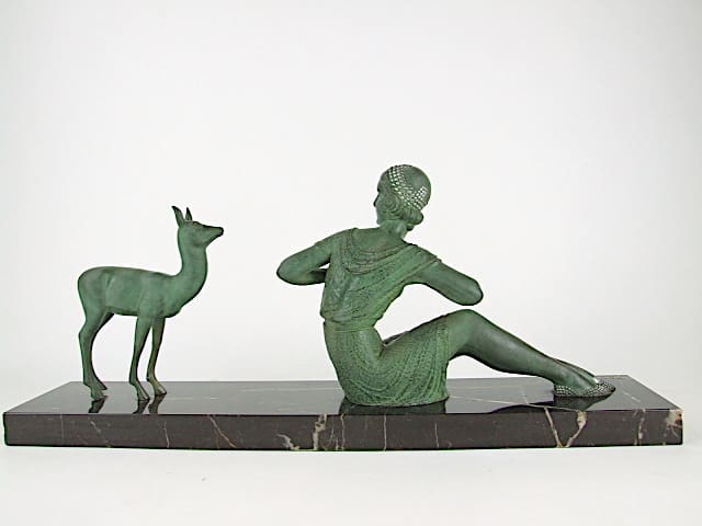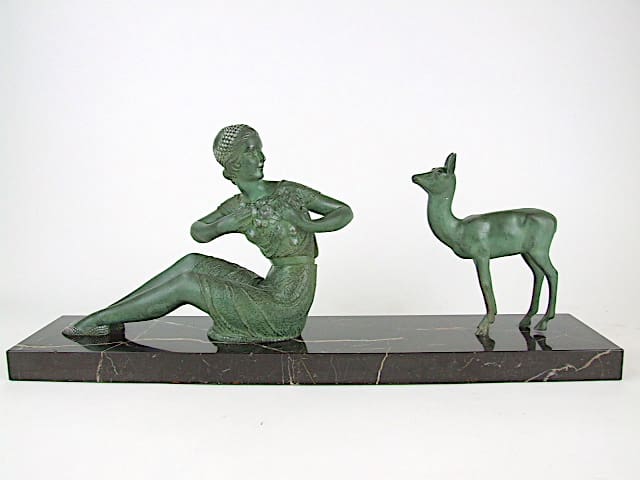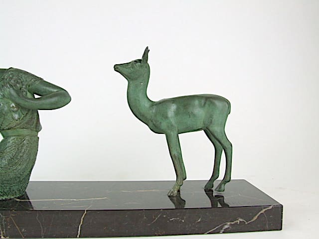 A spelter lady and deer with green patination mounted on a Belgian Black marble base and signed on the right hand front corner ‘D.H.Chiparus’. The lady is holding flowers against her chest wearing a lovely dress and a beaded cloche hat.