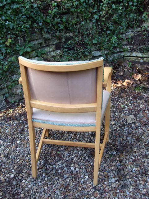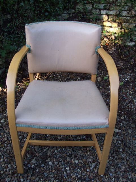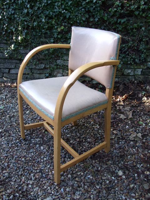 Blonde bent wood desk chair covered in a beige leatherette and trimmed in green braid. Probably early mid-century.
