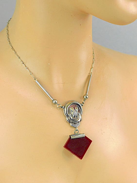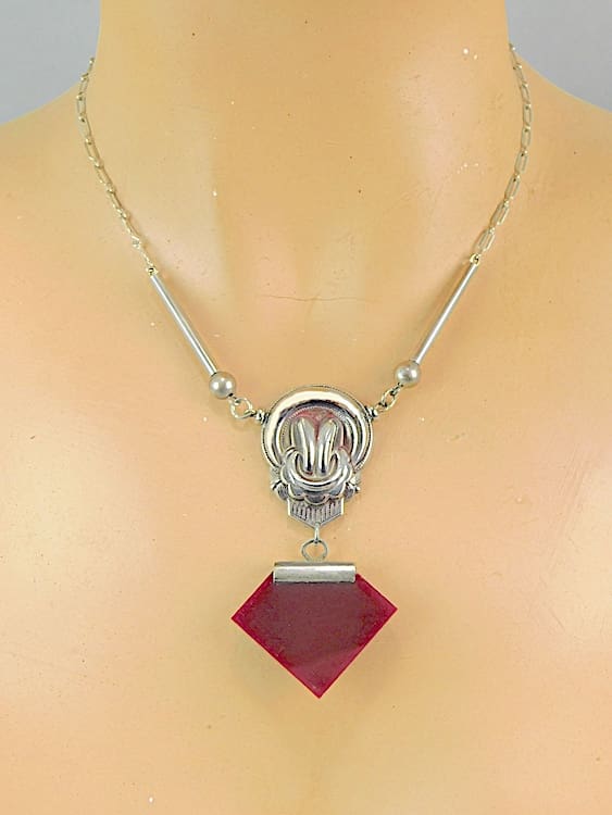 1930’s Jakob Bengel Diamond shaped necklace. With dark red galalith and chrome central section.