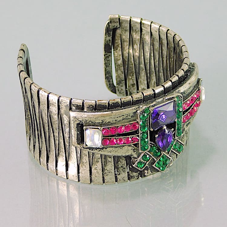 Silver metal bangle with pink, purple and green diamonte and glass stone patterning.