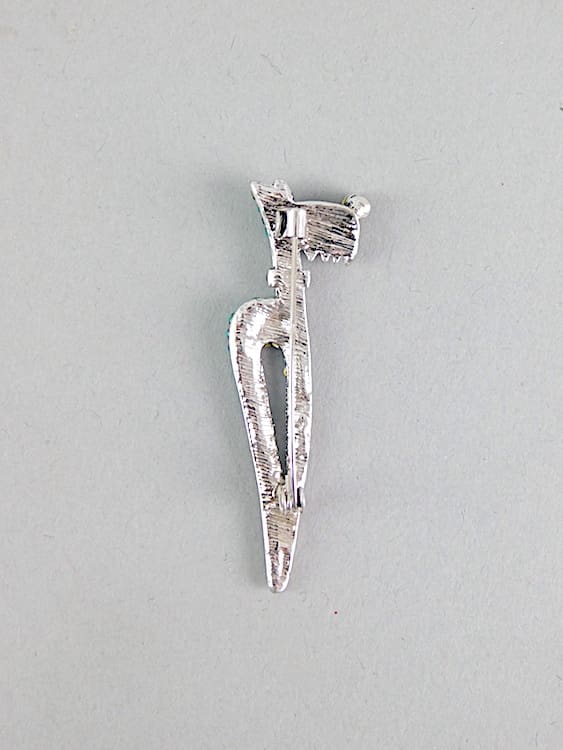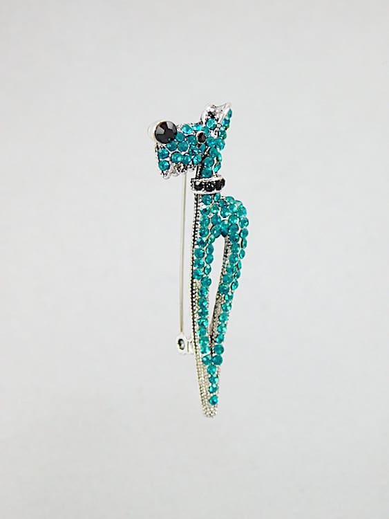 Blue diamonte dog brooch with black nose, collar and eye detail. Maker unknown.