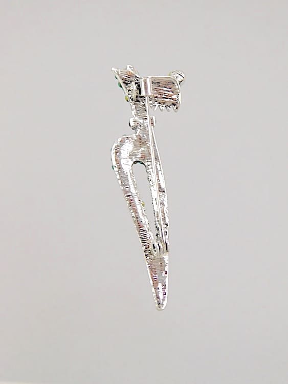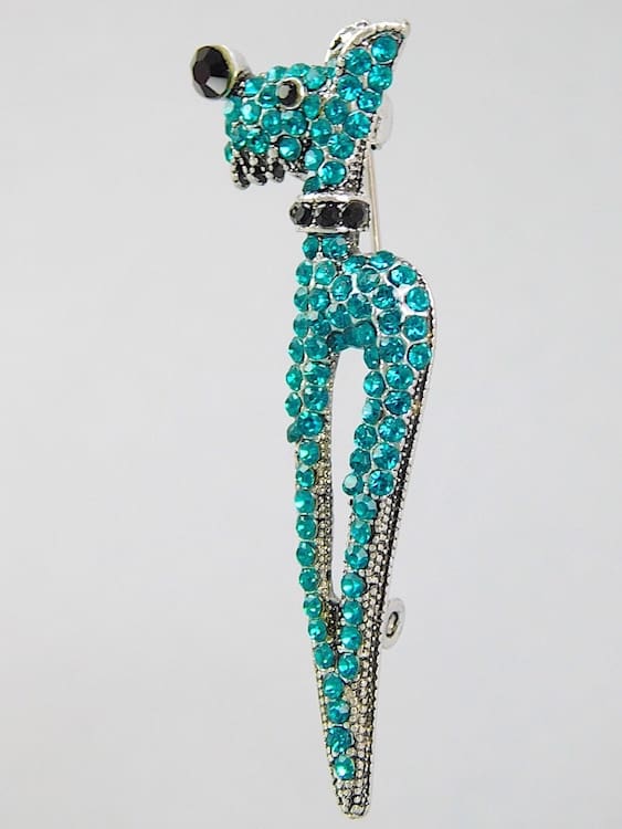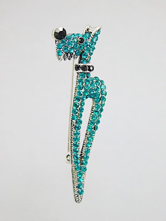 Blue diamonte dog brooch with black nose, collar and eye detail. Maker unknown.